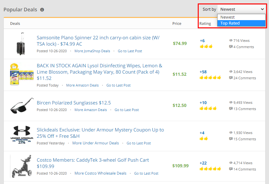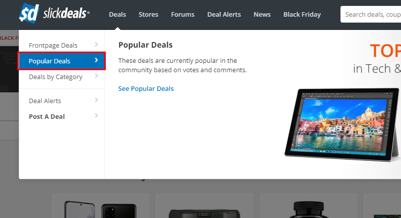 좋아요 수를 가장 많이 받은 제품을 확인해볼 수 있습니다. 사이트 상단 메뉴에서 Deals ▶ Popula Deals 로 들어갑니다.