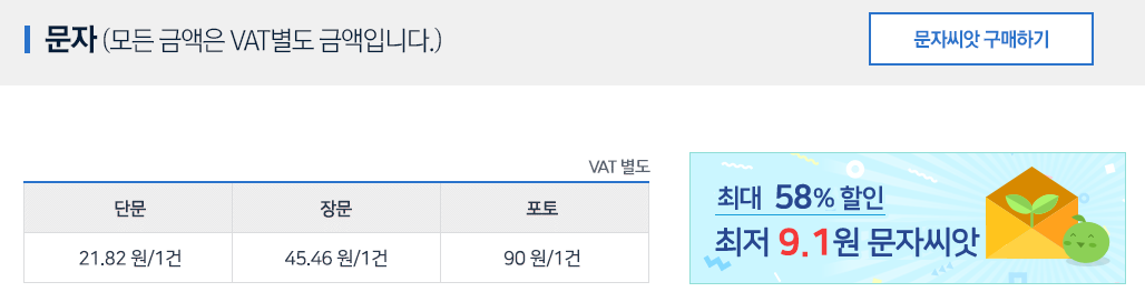 충전금액에 따라 달라지겠지만, 일단 홈페이지에서 설명하고 있는 문자 비용은 다음과 같네요.