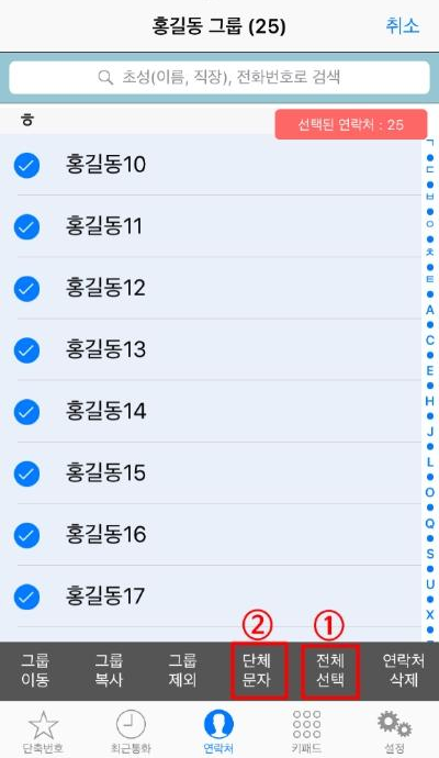 ①전체선택을 누르거나 원하는 사람을 선택하여 누른 다음,