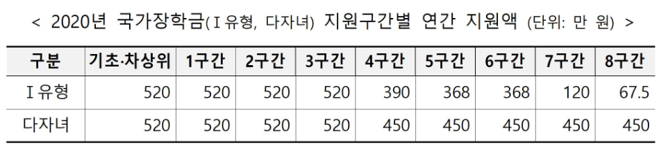 * 지원구간은 학생 본인과 가구원(부모 또는 배우자)의 소득?재산?부채 등으로 산정된 월 소득 인정액에 따라 결정되며, 지원구간 결정 후 산정 결과는 휴대전화와 전자우편으로 통지(2020년 6월)
