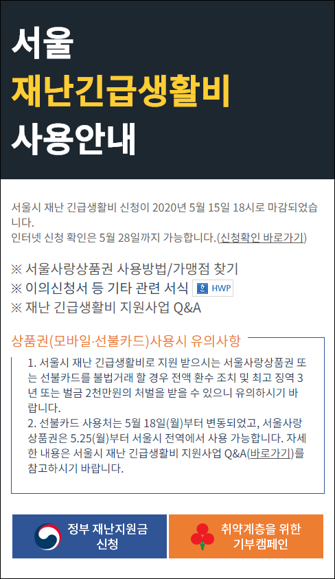 서울시 재난긴급생활비 신청이 5월 15일 오후 6시부로 마감이 되었습니다.