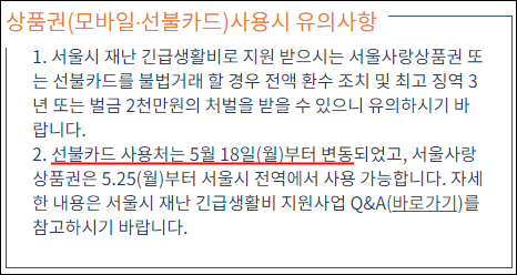 보통 정부나 자치/기초 단체에서 주는 재난지원금은 대형마트나 온라인 몰에서는 사용할 수 없었으나, 서울시에서 지급하는 재난긴급생활비로는 결제가 가능하여 형평성 논란이 있었습니다. 이런 가운데 정부지원금 선불카드 사용이 시작되자 혼선을 막기 위하여 사용처를 바꾼 것입니다.