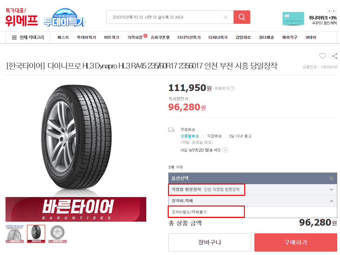 배송비가 최소 한짝 당 최소 1만원은 들어가게 되고, 타이어를 직접 차에 싣고 가야 한다는 번거러움이 있습니다.