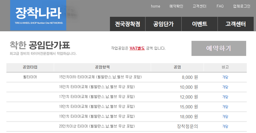 아래는 많이들 이용하는 공임나라와 장착나라의 공임 비용입니다.
