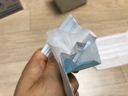총 50매가 들어있고, 10매 단위로 포장되어 있습니다. 보통 병원에서 쓰는 덴탈마스크도 이렇게 포장은 되어 있지 않고, 박스에서 하나씩 꺼내쓰는 방식입니다. 병원에서도 그렇게 사용을 하는데 큰 문제 삼지 않는다면, 이렇게 묶음 포장을 하거나 혹은 그렇게 하지 않음으로써 단가를 낮추는 것이 오히려 나을 수 있겠다는 생각도 듭니다.