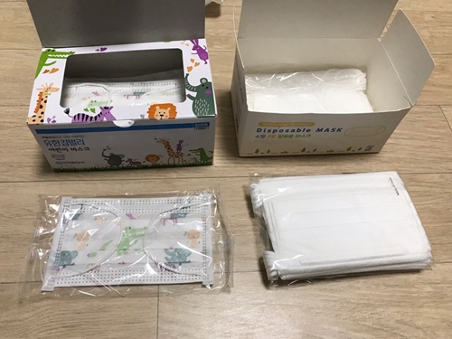 왼쪽은 유한킴벌리 어린이 마스크이고, 오른쪽은 중국산 소형 3중 일회용 마스크입니다.
