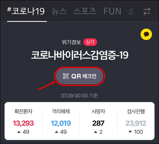 #코로나19 화면에서 가운데 QR 체크인을 눌러줍니다.