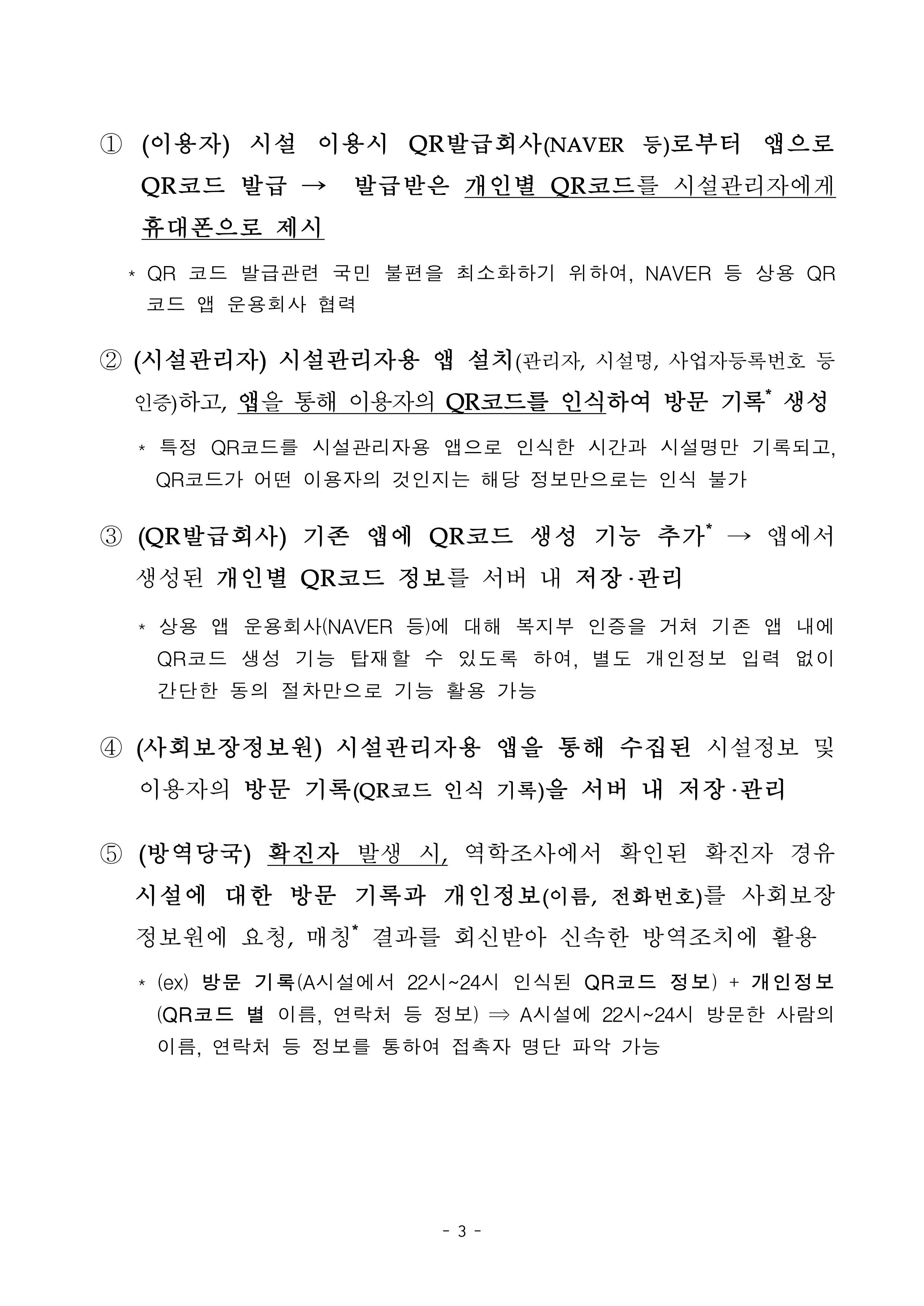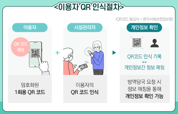 카톡, 네이버 등 QR 발급회사는 일회용 QR코드를 생성할 때, QR 정보와 생성시간만을 저장하고, 사회보장정보원의 전자 출입명부에는 시설명과 시간과 암호화된 QR만 저장합니다.