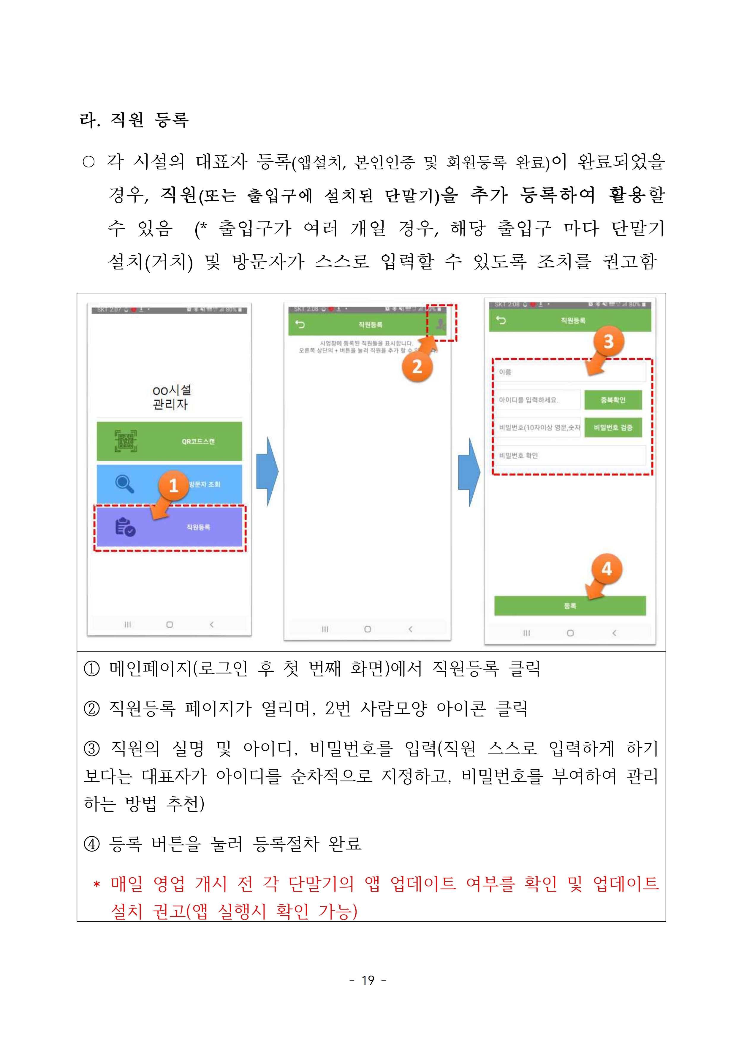 별도의 신청 절차는 없지만, 전자출입명부 앱을 통해서 회원가입 후 사용하시면 됩니다. 직원이 여러 명인 경우, 관리자 1명이 가입 후, "직원등록" 기능으로 직원 계정을 만들 수 있습니다.