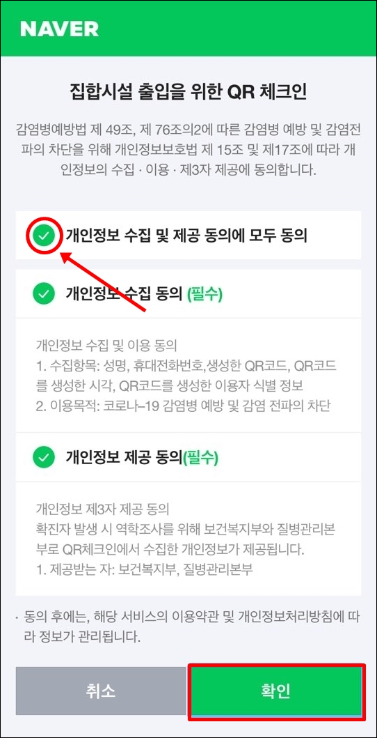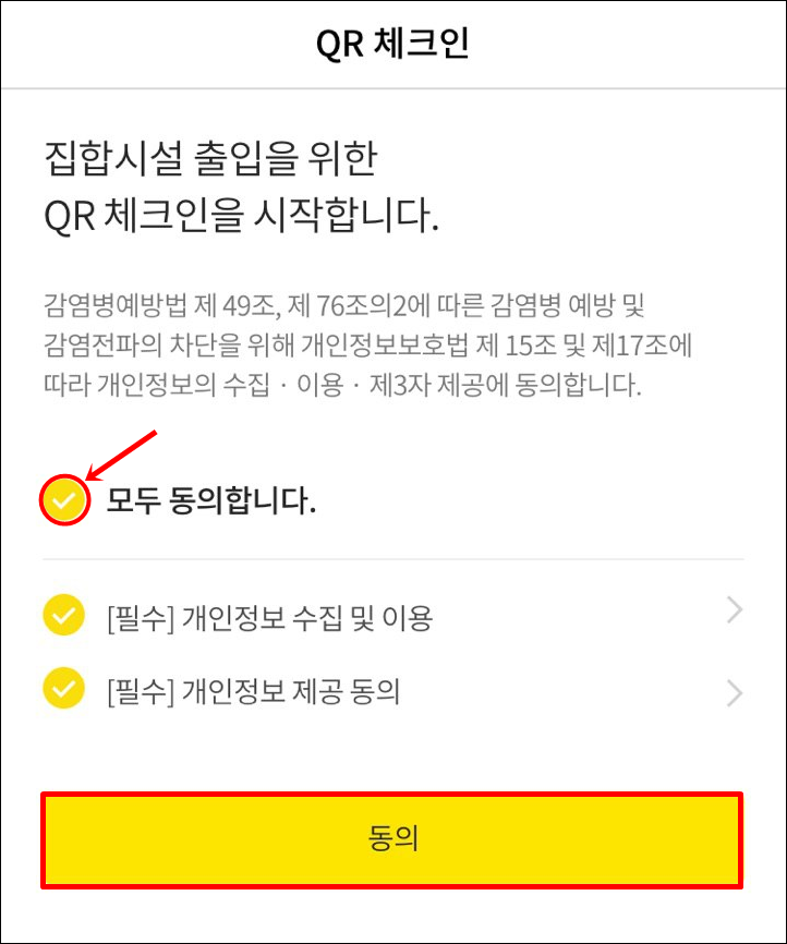 시설 출입시 동의에 따른 개인정보 수입과 이요 및 제3자 정보제공은 개인정보보호법 제15조 및 제17조, 위치정보보호법 제15조에 근거한 것입니다. QR코드를 이용하기 위하여 만들때마다 이에 관한 동의절차를 진행하게 됩니다.