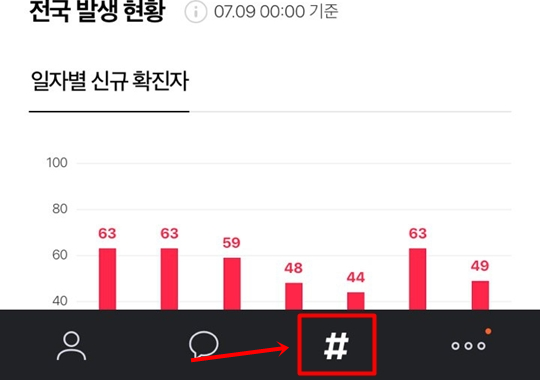 카톡 애플리케이션을 실행하여 밑에 세번째 탭인 "#"을 누릅니다.