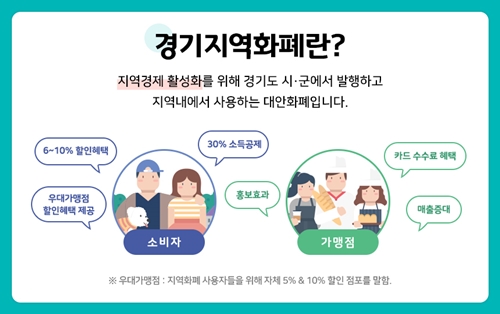 경기지역화폐는 지역경제 활성화를 위하여 경기도의 31개 시·군에서 발행하고 사용하는 것으로 대형마트나 백화점 등을 제외한 지역화폐 가맹점에서 현금처럼 사용할 수 있는 대안화폐입니다.