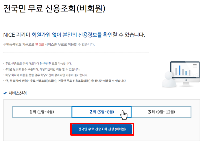아래는 PC에서 비회원으로 접속하는 방법입니다. "전국민 무료 신용조회 신청(비회원)"을 클릭하시면 됩니다.