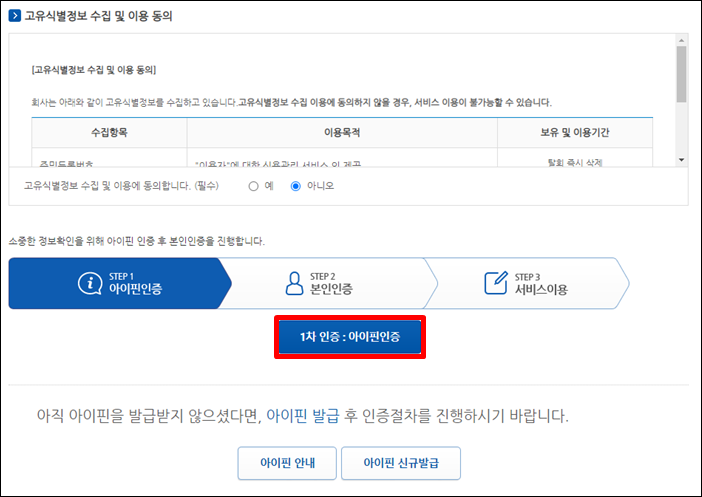 개인정보제공동의 3가지 필수 항목에 모두 "예"라고 표시해 주시고, 제일 아래에 "1차 인증 : 아이핀인증"을 클릭합니다.