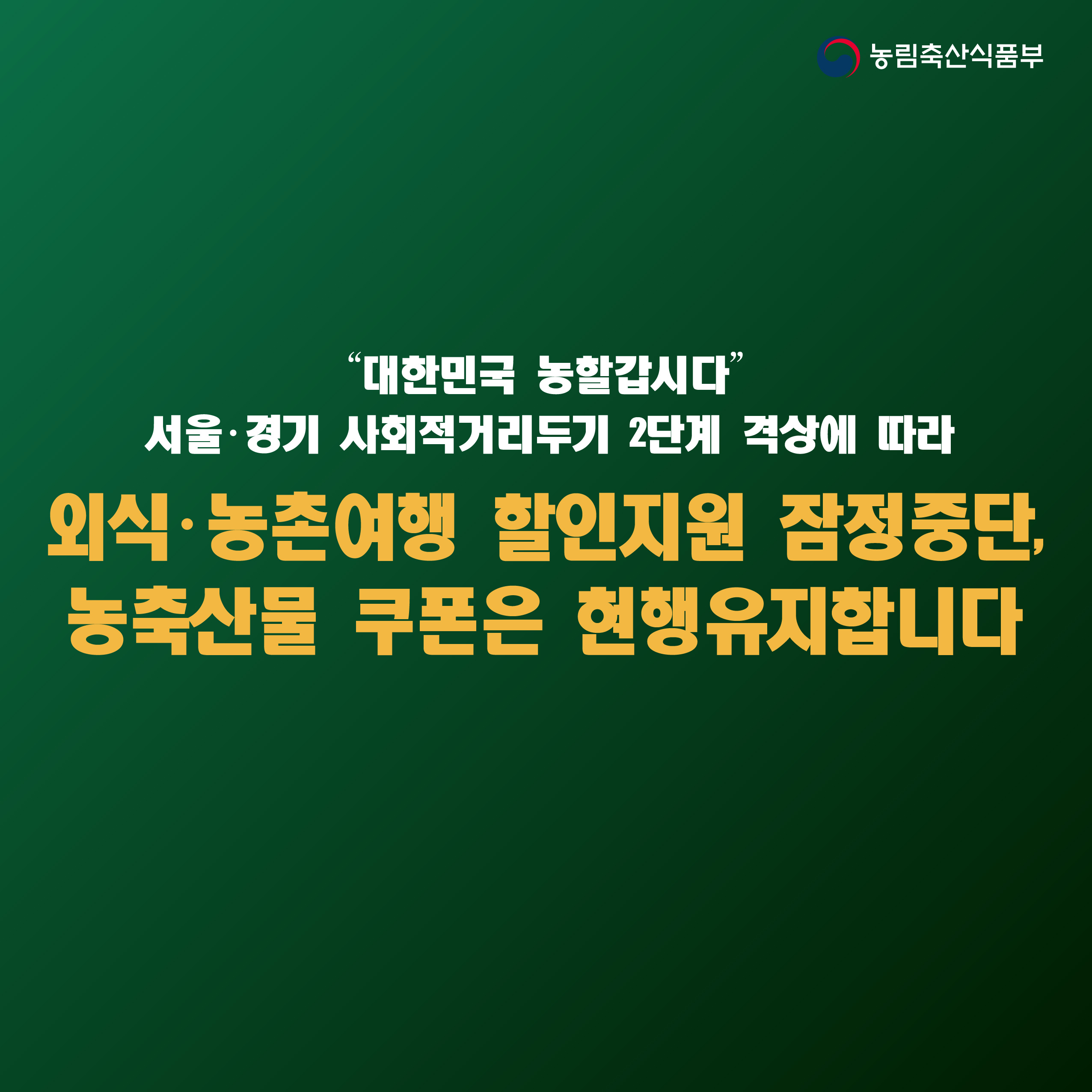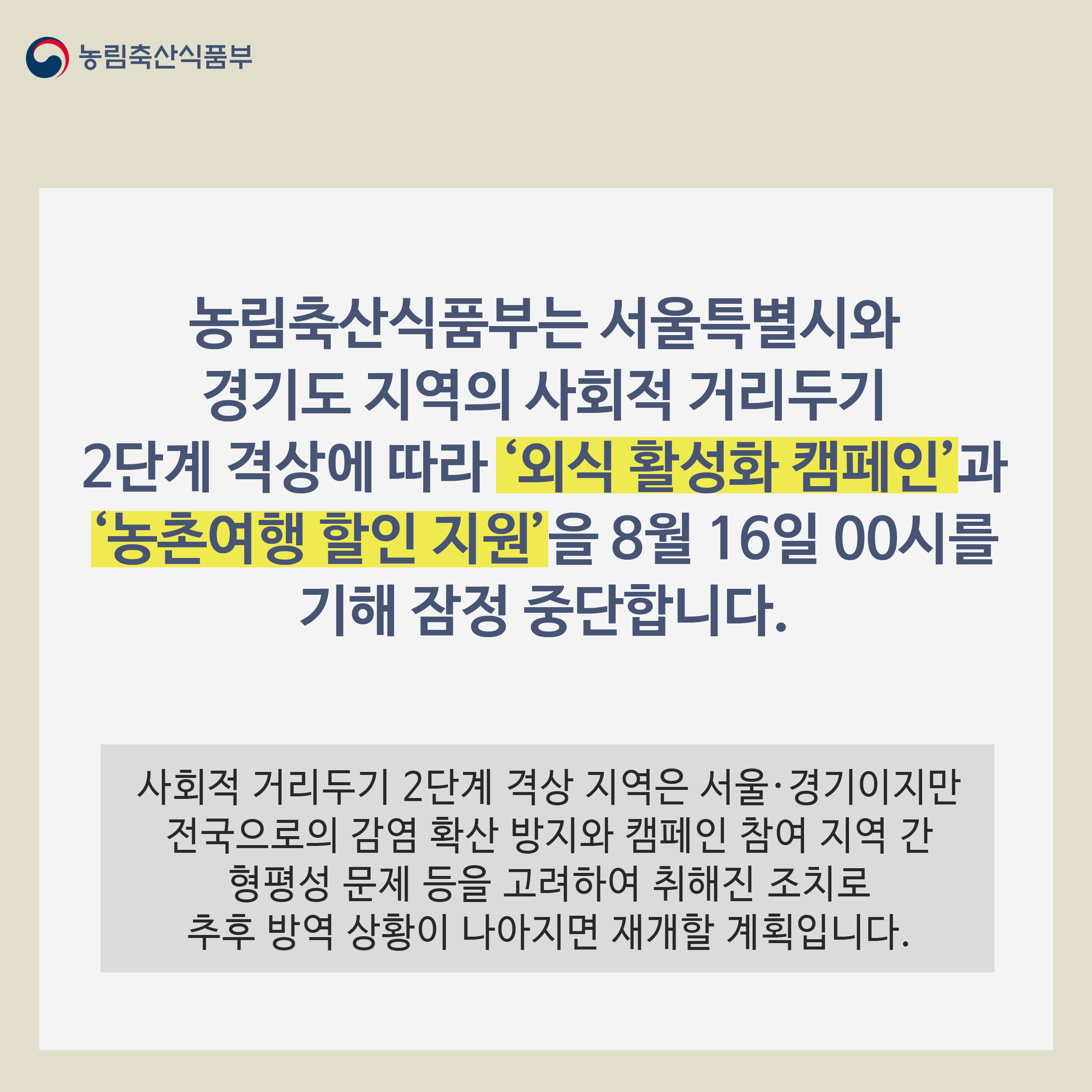 하지만 농촌 여행에 대한 할인권은 신규 발급을 잠정 중단합니다. 단, 현재까지 발급된 할인권에 한해서는 8월 말까지 철저한 방역 관리하에 사용토록 할 예정입니다.