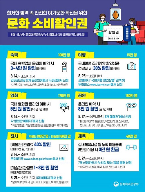 대한민국 숙박대전 대한민국 숙박대전 문화체육관광부가 코로나19로 인하여 침체된 경제를 살리기 위해 소비할인권 6종을 배포하며 안전한 여가문화도 즐기고, 관련 업계도 살리는 방안을 마련