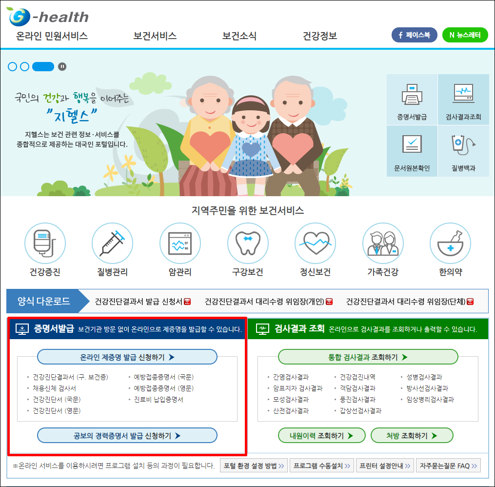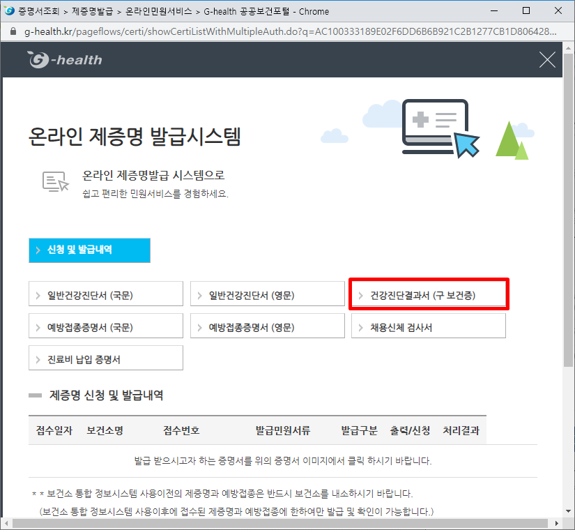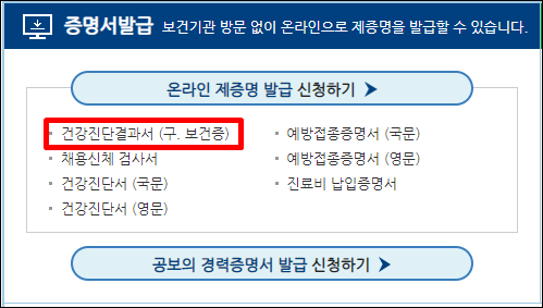 홈페이지에 접속 후 아래 증명서 발급란의 건강진단결과서(구. 보건증)를 클릭해 주세요