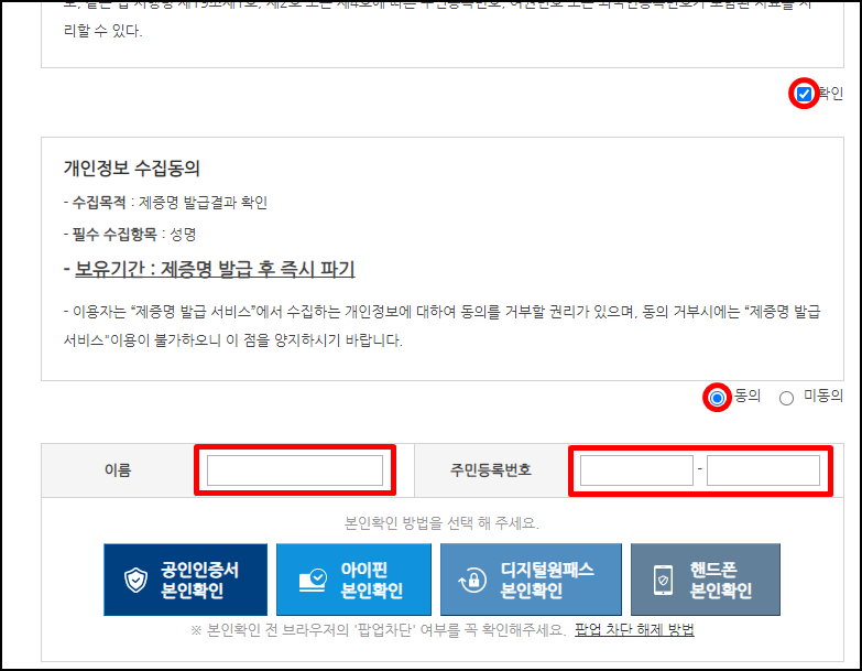 설치 완료 후 페이지 아래로 내려와서 개인정보 수집 안내에 대한 내용 확인과 동의를 클릭하시고 이름, 주민등록번호를 누르신 뒤에 본인학인은 진행하시면 됩니다.