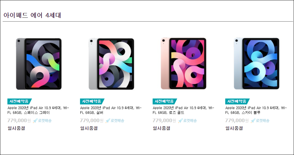 | 아이페드 에어4 | 64GB | 와이파이 | 779,000원 |