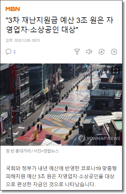 그리고 12월 2일에 드디어 국회 본회의를 통하여 내년도 예산안이 통과되었습니다. 3차 재난지원금 예산은 3조원이 책정되었으며, 홍남기 기획재정부 장관은 3차 재난지원금을 설 연휴 전에 지급한다 밝혔습니다.