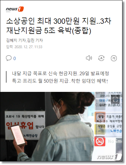 12월 27일(일) 더불어민주당과 정부, 청와대는 국회에서 고위 당정 협의회를 열고, 소상공인 및 자영업자에게 최대 300만원을 지원하는 것으로 의견을 모았습니다.