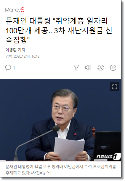 한편, 문재인 대통령은 수석 보좌관 회의 시 취업이 어려운 취약계층에 정부가 직접 100만개 이상의 긴급 일자리를 제공할 계획이라고 밝히기도 하였습니다. 또한 새해 시작과 함께 조기에 집행하도록 요구하였습니다.