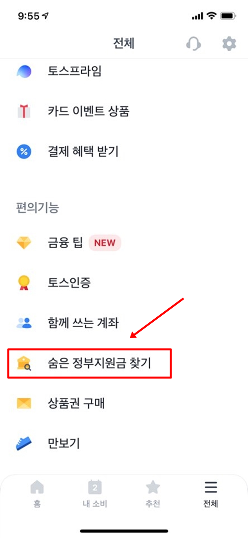 오른쪽 아래 '전체' 메뉴로 들어간 다음에 스크롤을 가장 아래로 내리면 '숨은정부지원금 찾기'로 들어가세요.