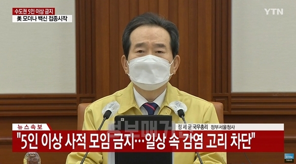 정세균 총리는 5인 이상 집합금지 명령을 수도권뿐만 아니라 전국으로 적용한다고 발표하였습니다. 사적인 모임을 금지하여 연말, 연시 방역을 힘쓰기 위함입니다. 이는 사회적 거리두기 3단계의 방역지침인 '10인 이상 집합금지'보다 강도 높은 조치에 해당합니다.