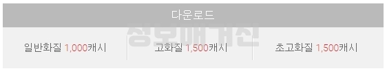 하지만 이 부분은 유료서비스입니다. 회원가입 및 로그인 하신 뒤에 지불해야 합니다. 스트리밍이나 다운로드 모두 동일하게 일반화질 1,000캐시, 고화질과 초고화질은 1,500캐시입니다.
