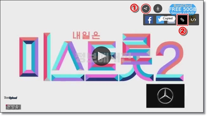 영상 전체를 다운로드 할수도 있습니다. 영상 오른쪽 상단에서 ①'공유버튼' ▶ ②'링크버튼'을 눌러서 바로가기 주소를 복사해주세요.