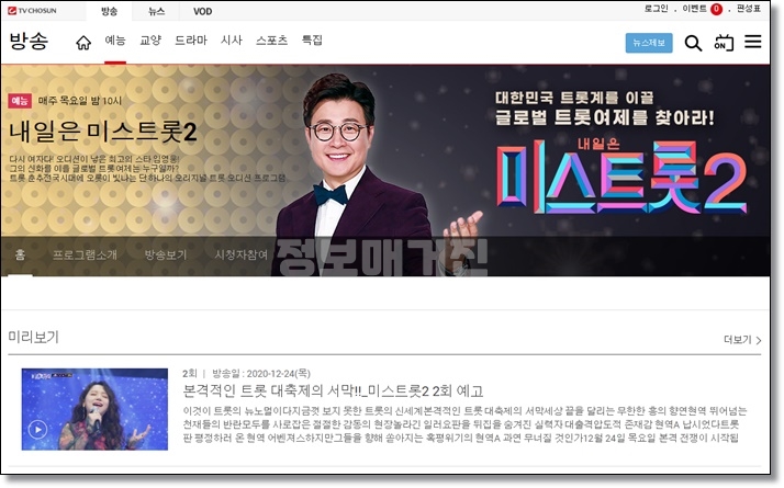 먼저, TV조선 홈페이지 내일은 미스트롯2 에서 볼 수 있는 방법입니다. PC뿐만 아니라 스마트폰에서도 시청이 가능합니다. 그리고 무엇보다도 TV조선에서 공식적으로 제공해주는 것으로 삭제될 걱정이 없다는 것입니다.