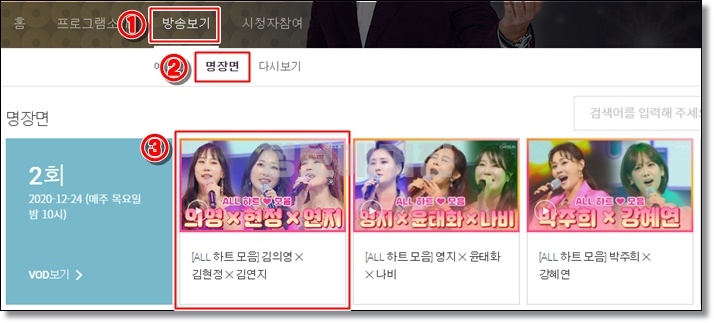 홈페이지에서 ①'방송보기' ▶ ②'명장면'으로 들어가면 미스트롯2의 해당 회차의 ③명장면들을 나눠서 볼 수 있습니다.