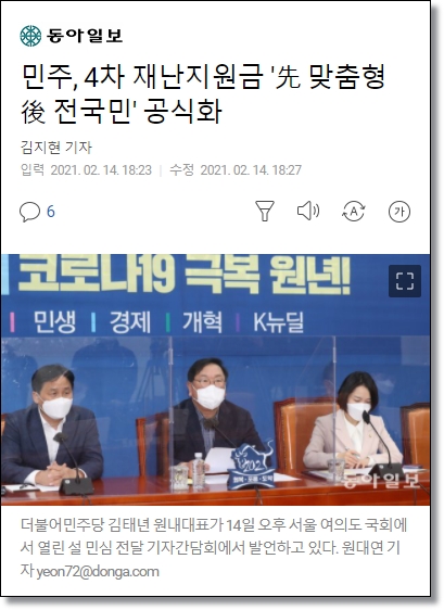 2.14. 민주, 4차 재난지원금 '선 맞춤형 후 전국민' 공식화
