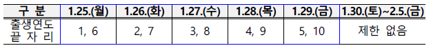 안정적인 온라인 신청을 위해 첫주 평일은 5부제를 시행합니다. 1.25.(월)~1.29.(금)에는 신청자 본인의 출생연도 끝자리에 따라 지정된 요일에만 신청이 가능하며, 1.30.(토)~2.5.(금)에는 자유롭게 신청할 수 있습니다.