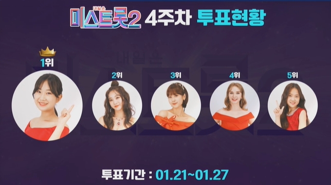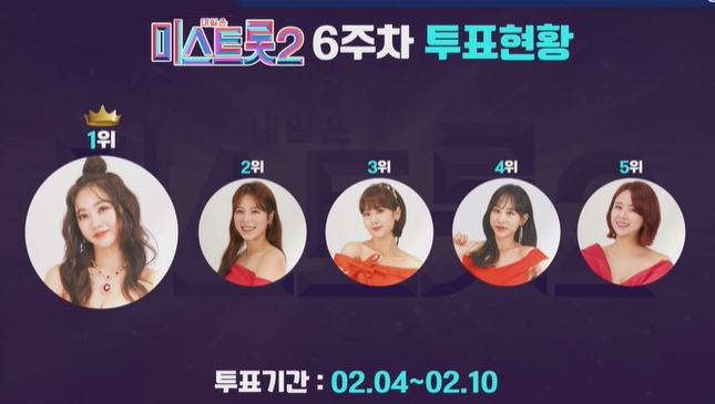 지난 1월 1일부터 6일까지 진행된 미스트롯2 1주차 투표결과는 1위가 전유진, 2위 홍지윤, 3위 강혜연, 4위 김의영이었습니다.