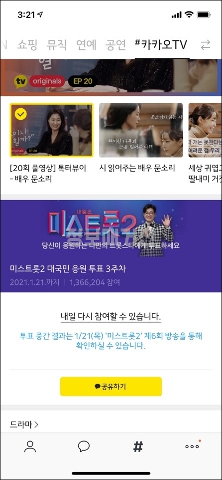 그러면 상단에 #카카오TV 메뉴가 나옵니다. 보이지 않는다면 옆으로 밀어주면 숨어 있던 메뉴를 확인하실 수 있습니다. 그리고 아래로 내리면 '미스트롯2 대국민 응원 투표' 페이지를 확인하실 수 있습니다.