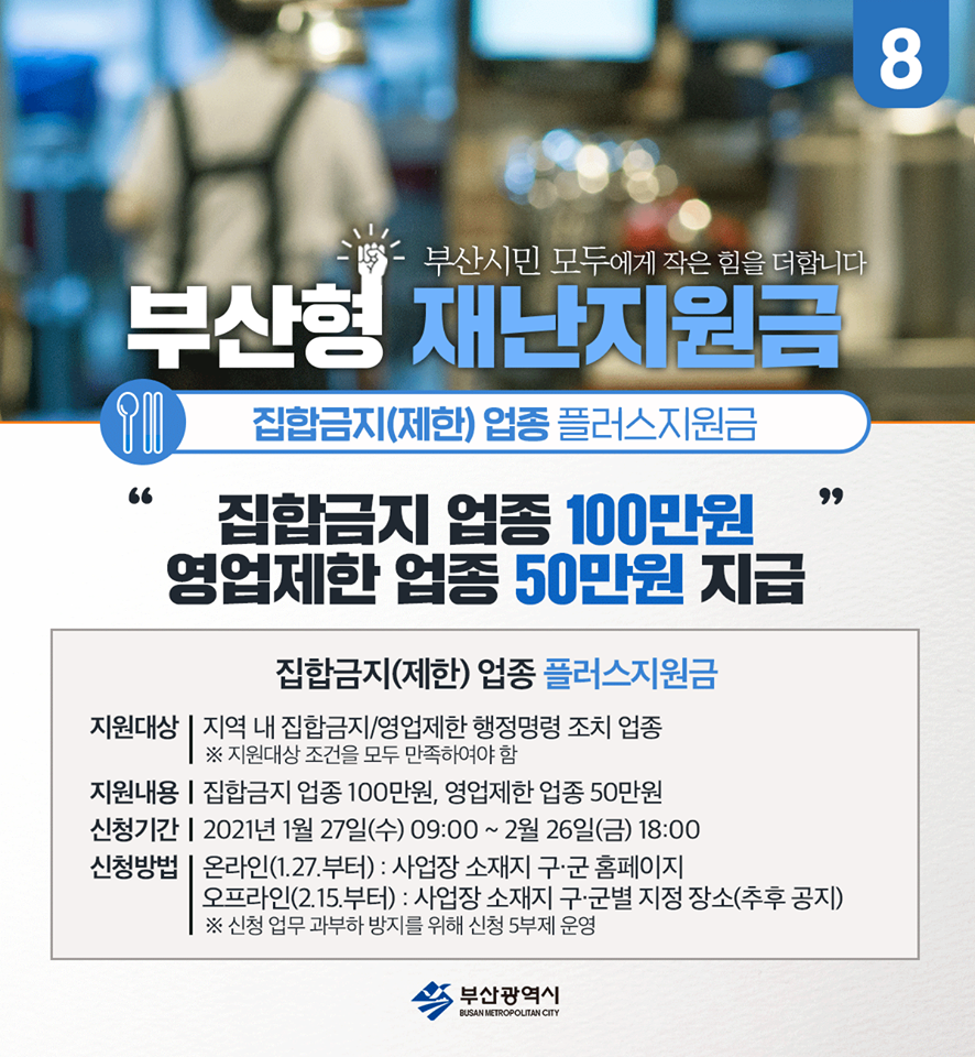 부산형 플러스지원금 신청방법에 관한 자세한 내용을 알려드립니다. 정부 지원금에 더하여(플러스) 집합금지 업종에는 100만원, 영업제한 업종에는 50만원을 지급합니다.