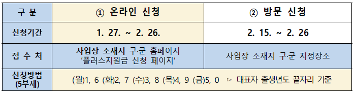 ○ 사회적 거리두기 실천을 위해 온라인 신청이 원칙임. 주민센터 방문 신청은 2. 15(월)부터 출생연도에 따른 5부제 확인 후 방문