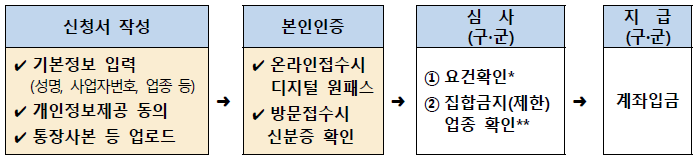 * 단, 비영리 사업자, 법인격 없는 조합은 지원 제외 - 관계법령에 따른 인·허가 및 신고 업종의 경우 소관기관(부서)의 인·허가 및 신고 절차 미이행 사업자 지원 제외