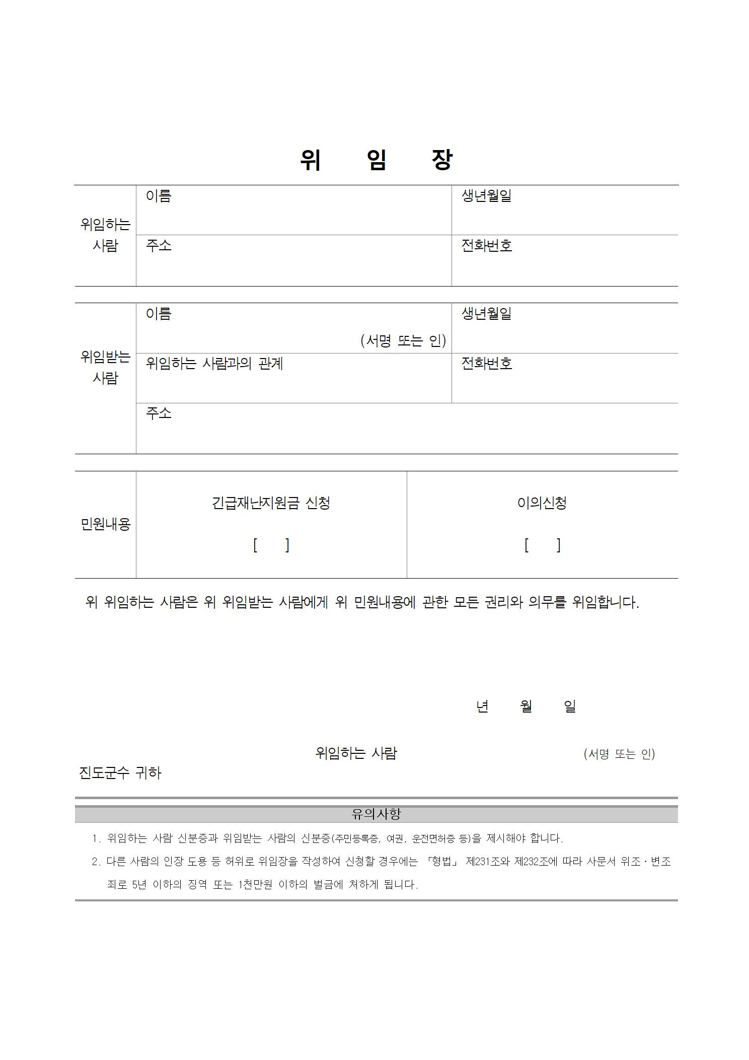 진도군 긴급재난지원금 신청방법에 관한 내용을 자세하게 알려드립니다. 신청서뿐만 아니라 위임장과 이의신청서 한글파일도 다운로드 하세요! 3월 31일까지입니다.