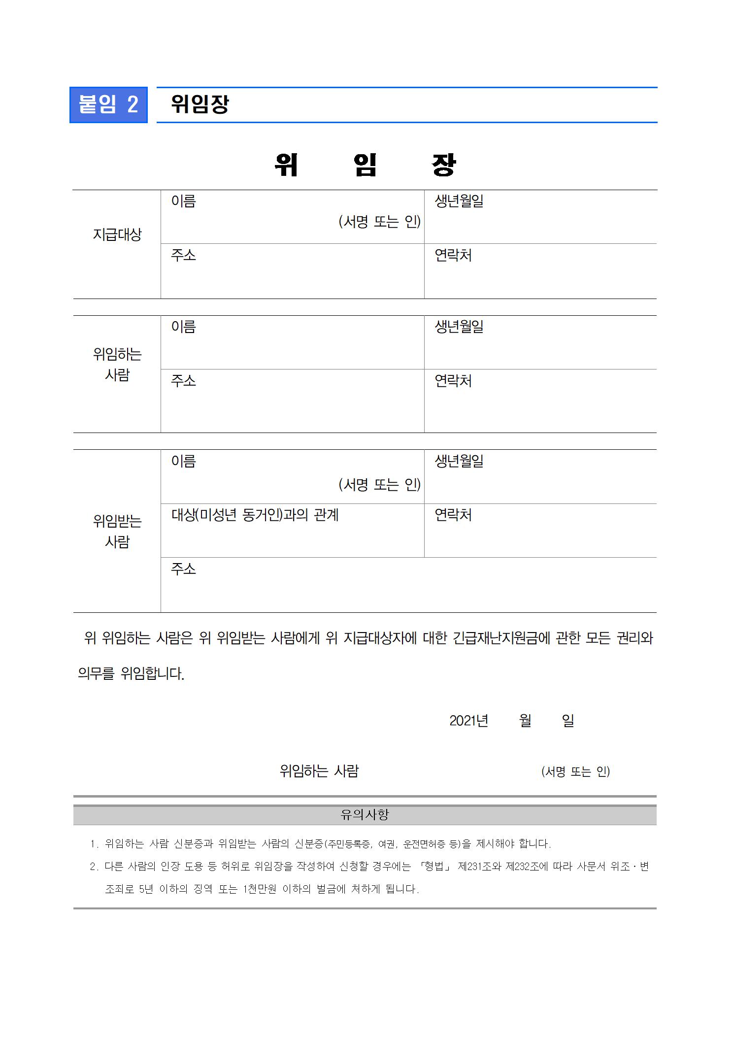 - 부득이한 경우, 동거인의 위임을 받아 세대주가 대리 신청 가능