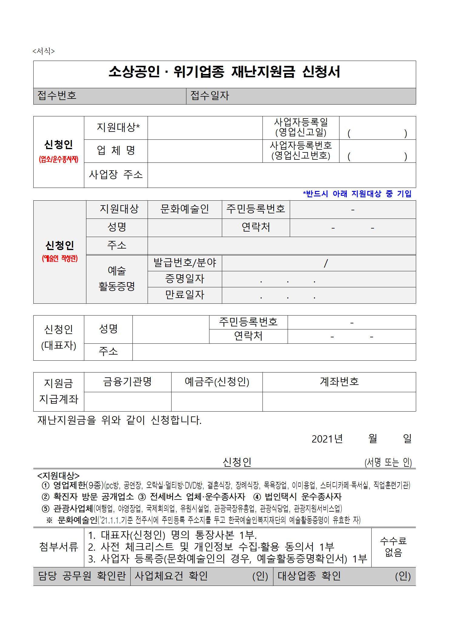 소상공인·위기업종 재난지원금 신청서