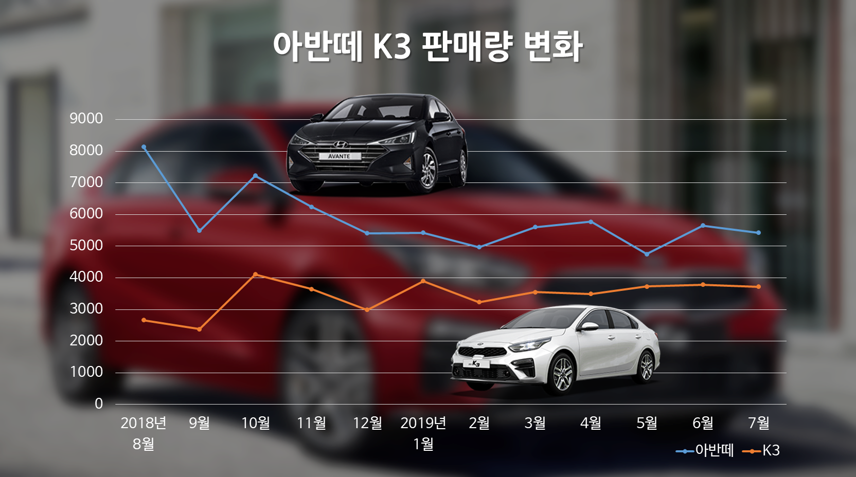 2018년에만 해도 아반떼 판매량이 압도적이었지만, 2018년 9월 '삼반떼' 출시 이후에 상당히 좁아진 것을 알 수 있습니다.(자료제공 : 다나와 자동차 판매실적)