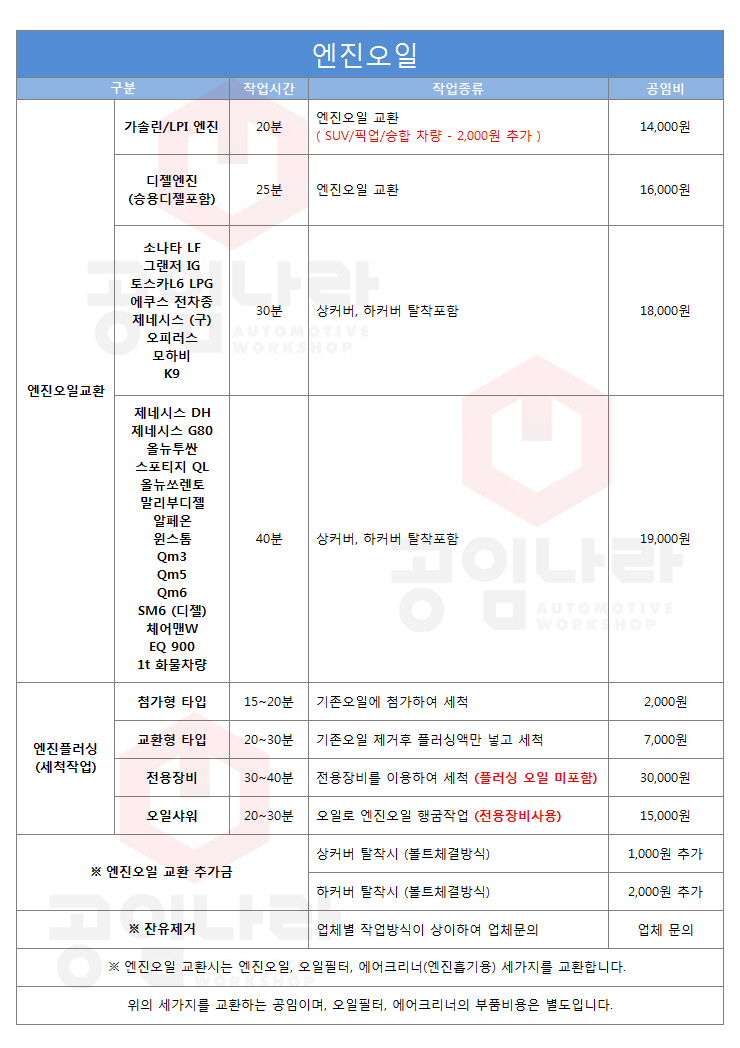 아래 자료 사진을 보면 일반 가솔린 차량 엔진오일 공임비는 14,000원입니다.