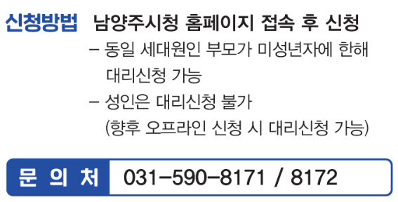 단, 내국인과 관계가 있는 외국인(남양주시민과 혼인한 외국인 등)이 주민등록상 동일가구로 있는 경우에는 지원 대상으로 포함된다고 합니다.(오프라인 신청만 가능)