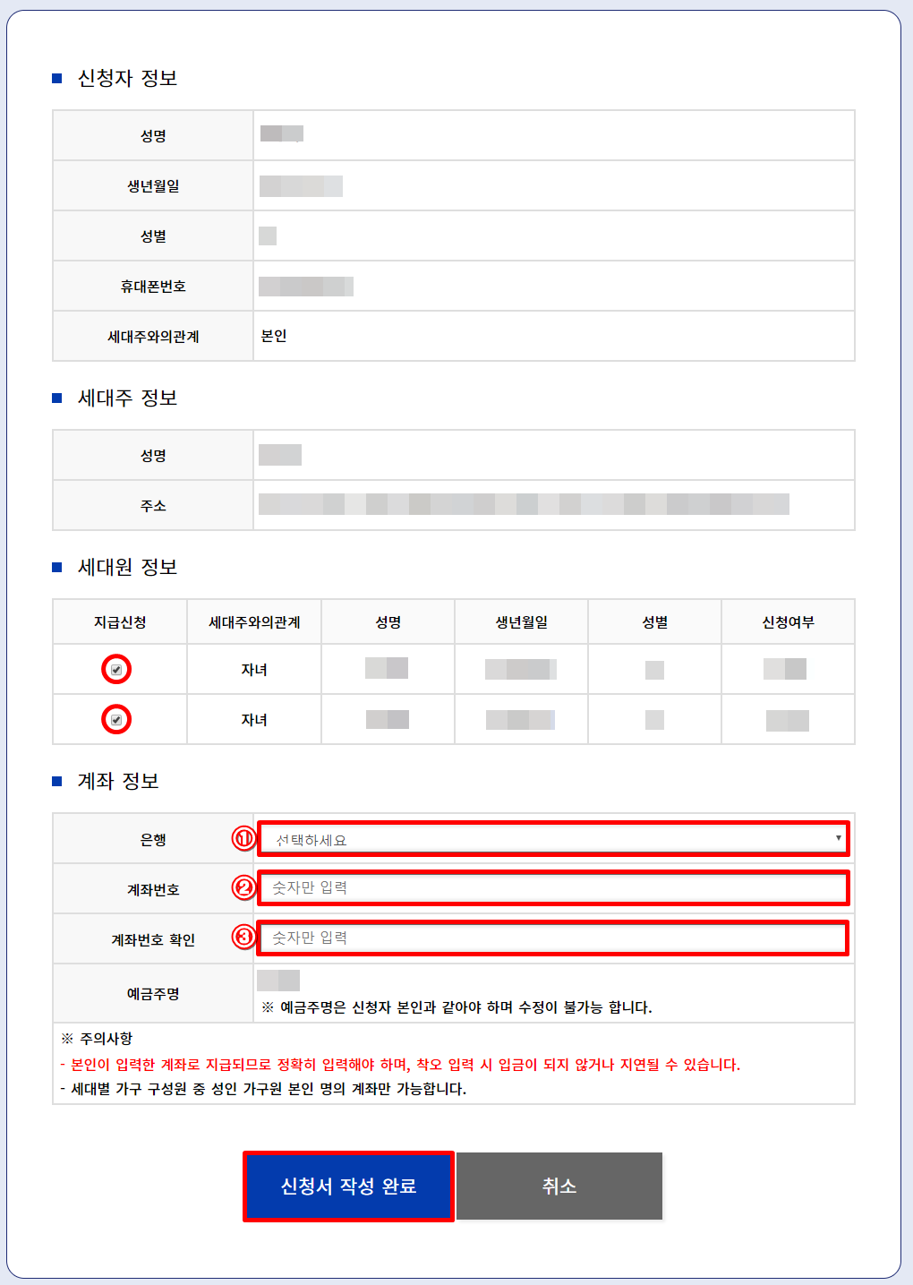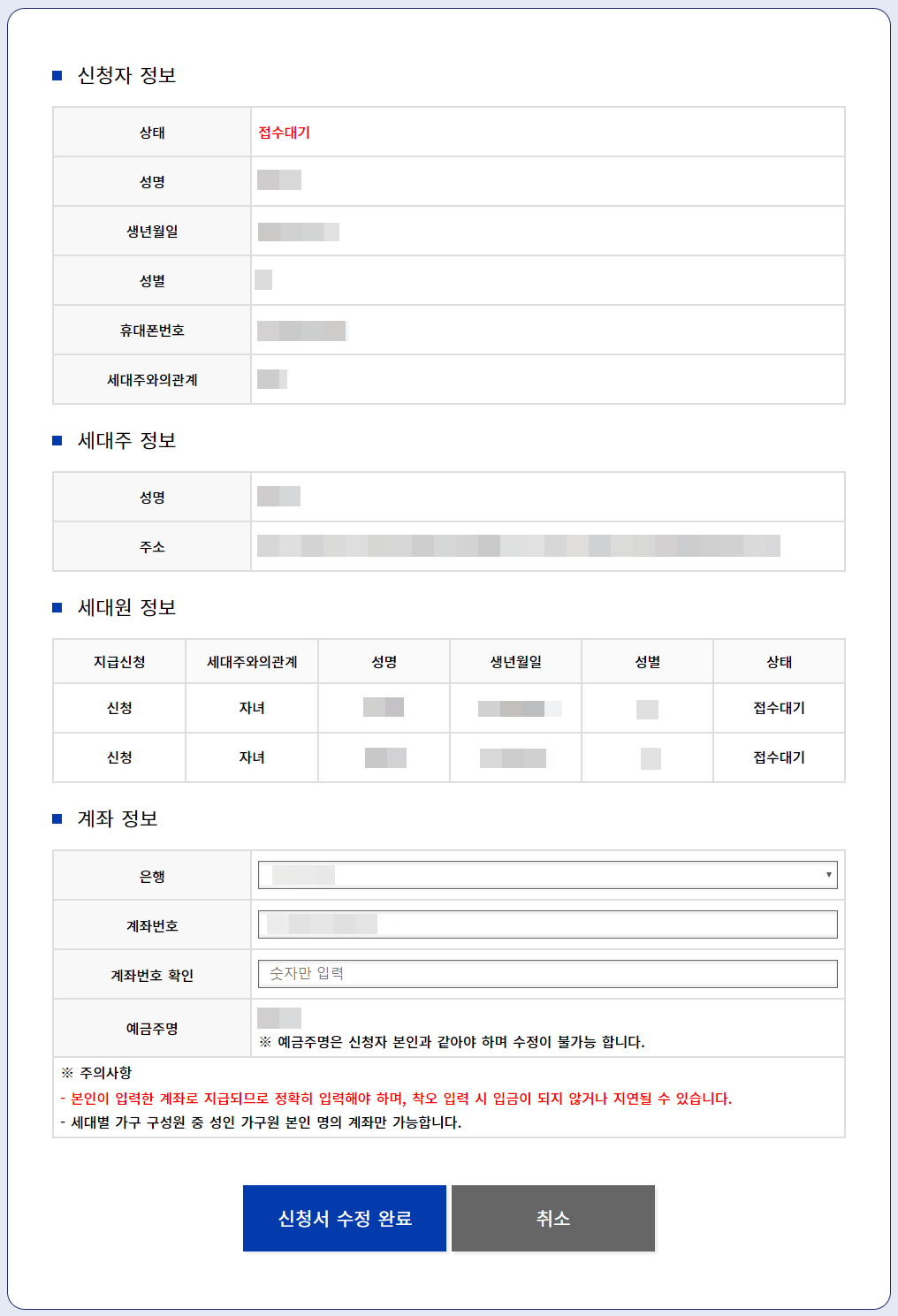 예금주 명과 신청자 본인과 같아야 하기 때문에 이 부분 주의하시기 바랍니다. 또한 신청 접수가 완료되면 수정이 불가능하니까 몇 번이라도 더 확인하시기 바랍니다.