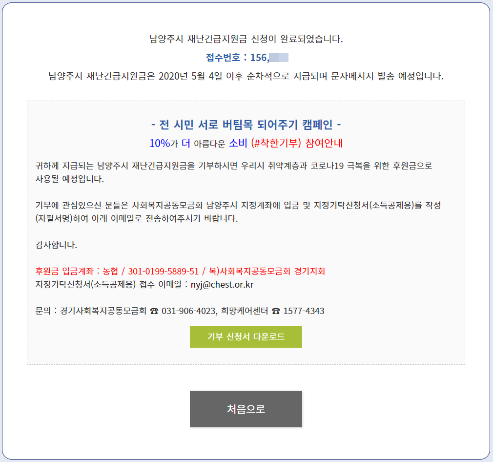 남양주시 재난긴급지원금 신청이 완료되었습니다.