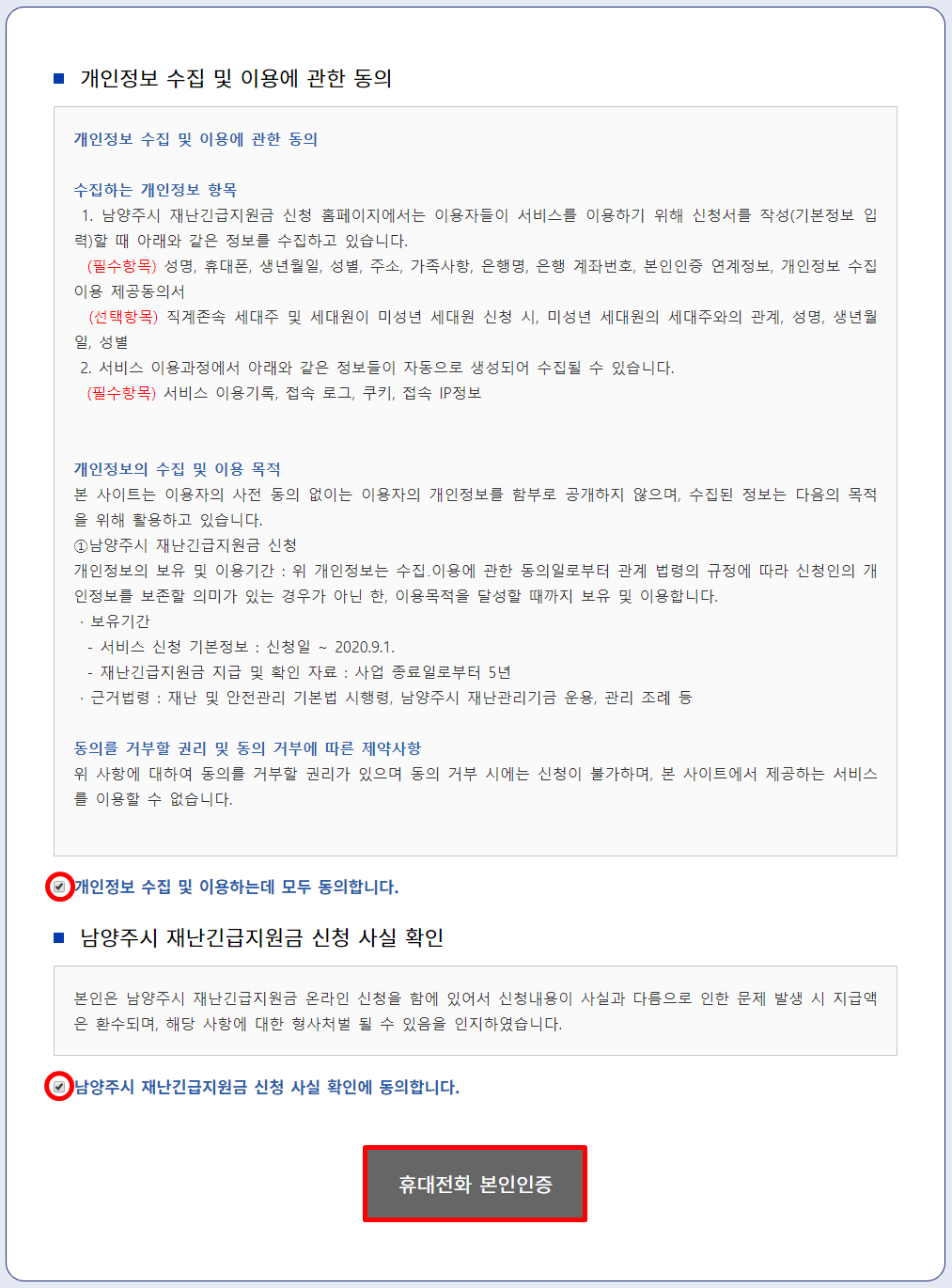 개인정보 수집 및 이용, 남양주시 재난긴급지원금 신청 사실 확인에 동의해 주세요. 필수 항목입니다.